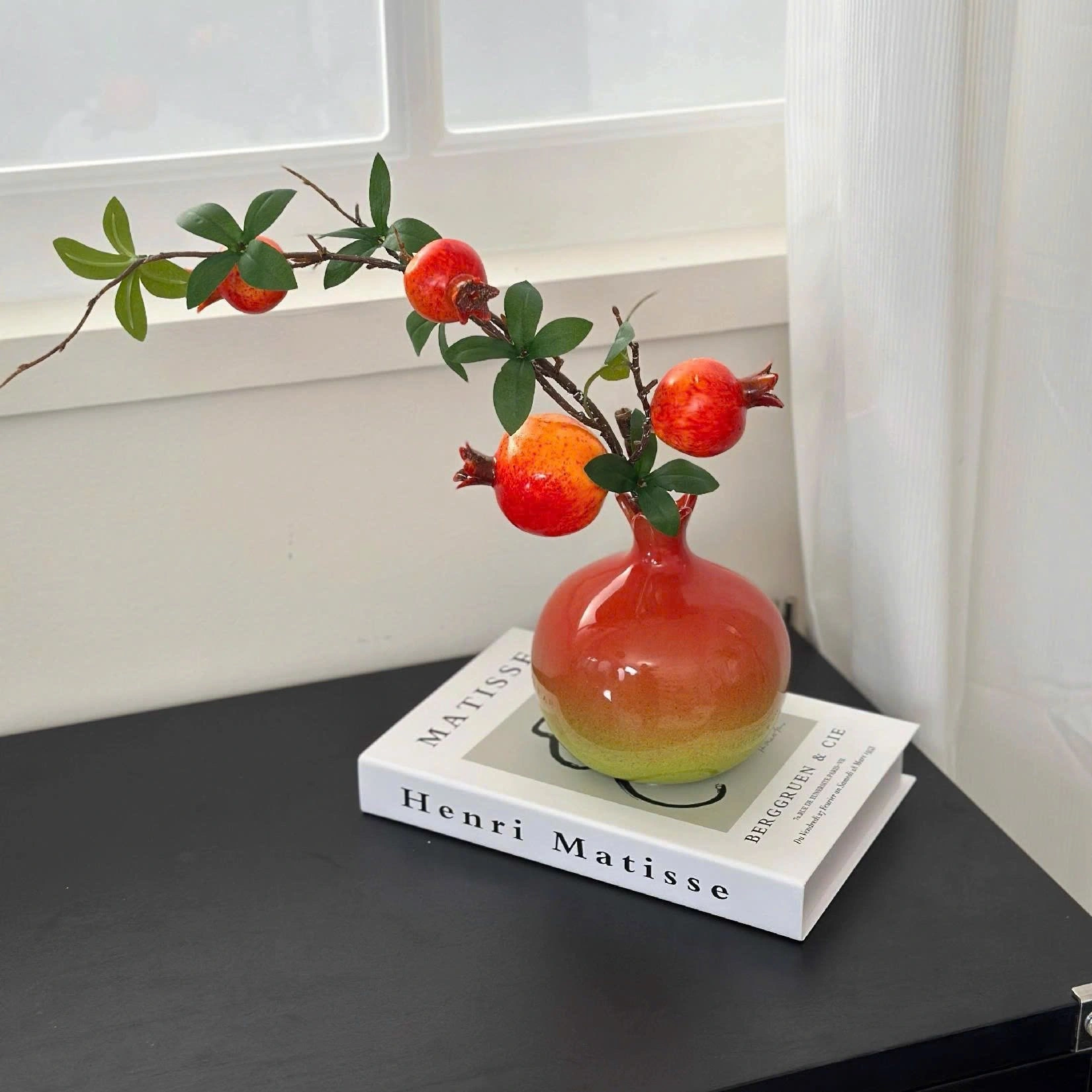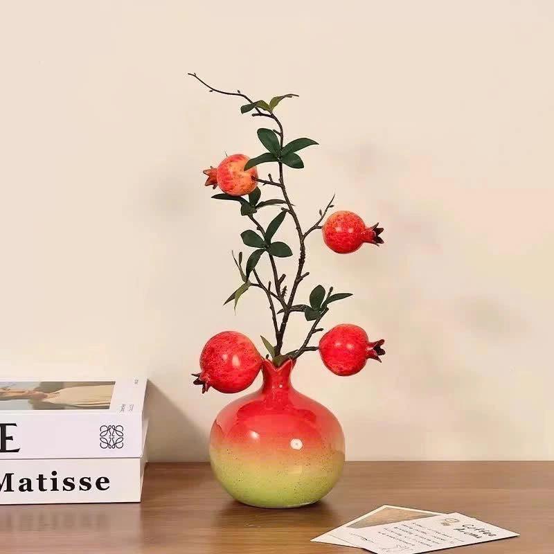 Mô tả chi tiết Set bình gốm sứ hình quả lựu kết hợp cành lựu đỏ là lựa chọn decor hoàn hảo để mang lại sắc màu tươi mới và tài lộc cho không gian sống. Bình sứ được tạo hình quả lựu độc đáo với kỹ thuật chuyển màu men từ đỏ sang vàng xanh tinh tế, lớp men bóng mịn cao cấp. Đi kèm là cành lựu giả được chế tác tỉ mỉ, quả căng mọng, mang ý nghĩa tượng trưng cho sự sung túc, con đàn cháu đống và may mắn trong phong thủy.