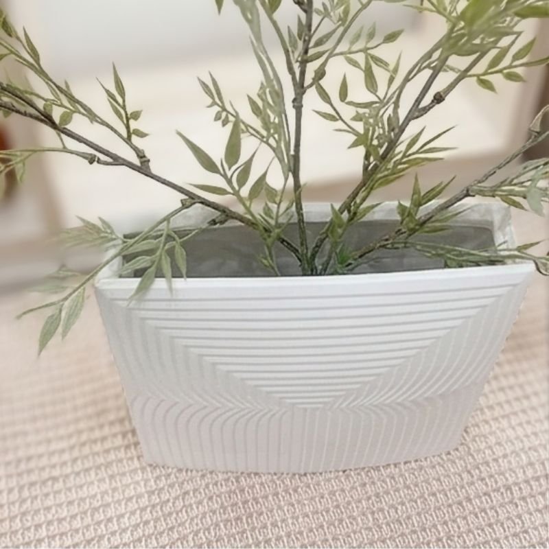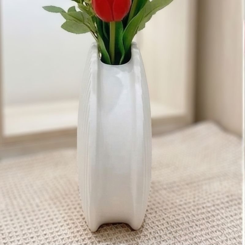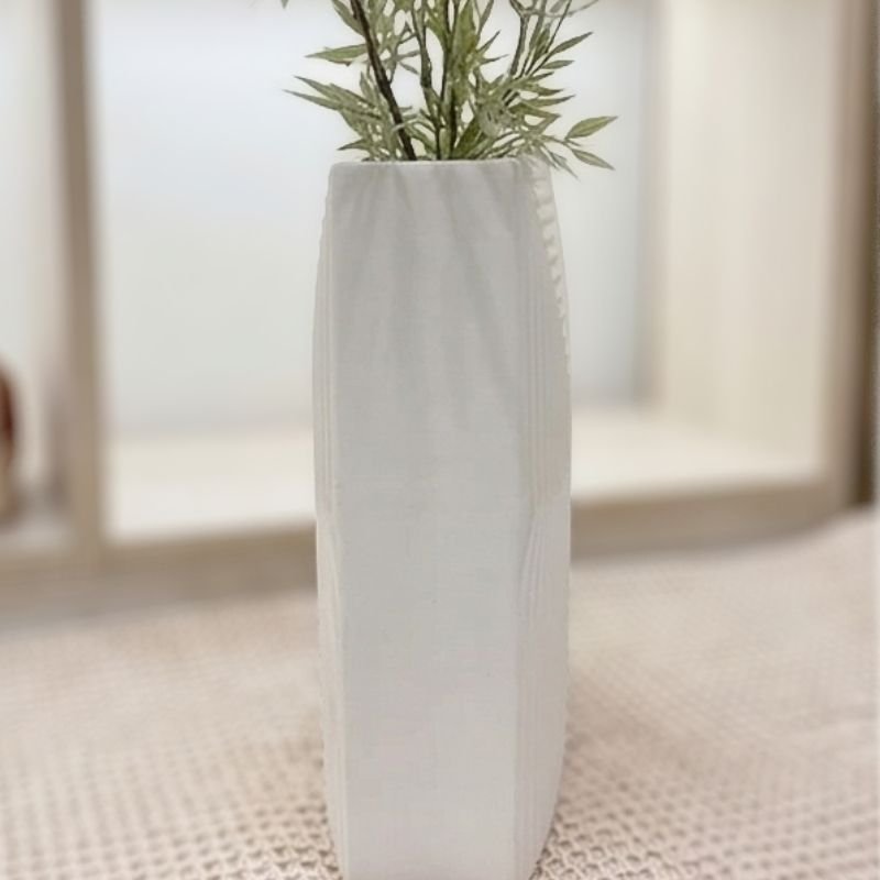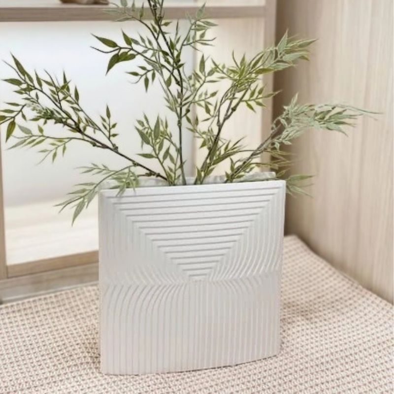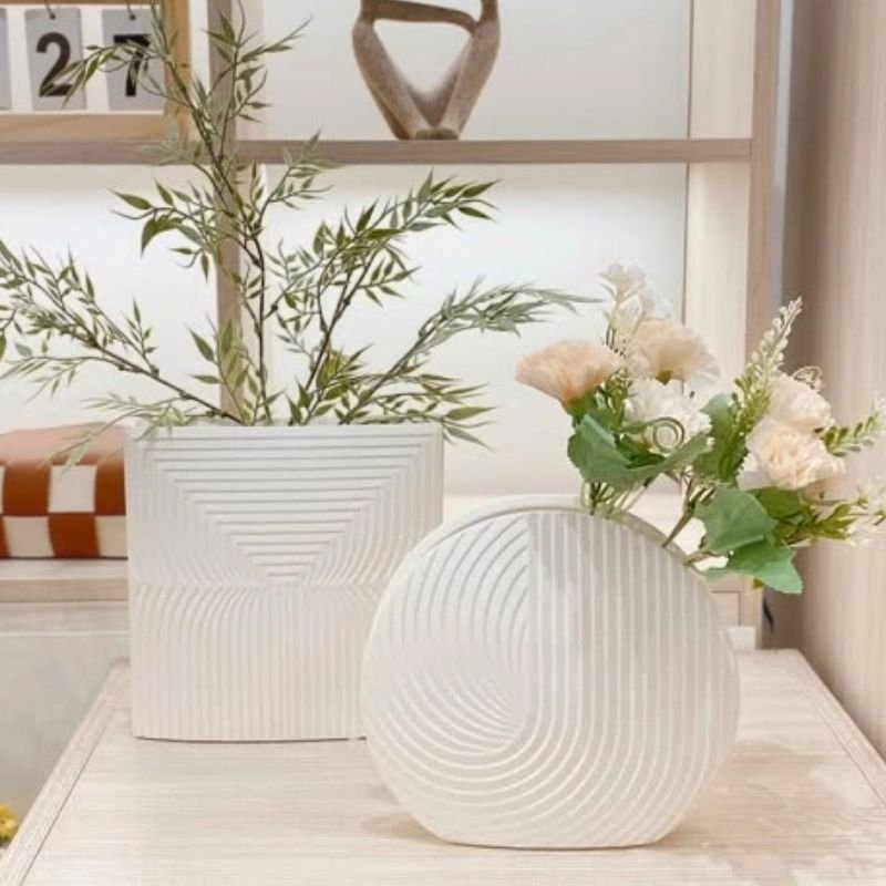 Bộ bình hoa decor sứ trắng vân sóng và xoáy là sự kết hợp nghệ thuật độc đáo giữa hai kiểu dáng: Bình Hoa Sứ Trắng Chữ Nhật Vân Sóng thanh lịch với vân dọc line sóng và Bình Hoa Sứ Trắng Tròn Xoáy Ocean Wave mềm mại với vân xoáy ốc cuốn hút. Với bề mặt gốm sứ trắng lì tinh tế và nghệ thuật vân nổi, bộ sản phẩm mang lại vẻ đẹp tối giản, hiện đại, sang trọng cho mọi không gian sống.
