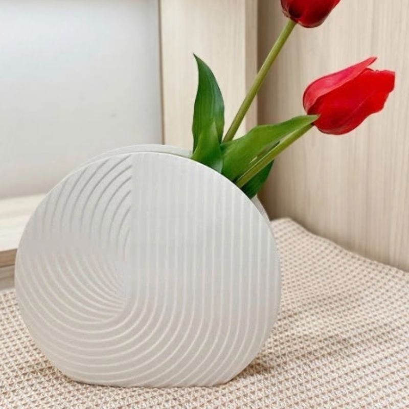 Bình Tròn Dẹt: Với vân xoáy ốc nghệ thuật cuốn hút, tạo cảm giác mềm mại, uyển chuyển. Miệng bình hẹp ở trên cùng.