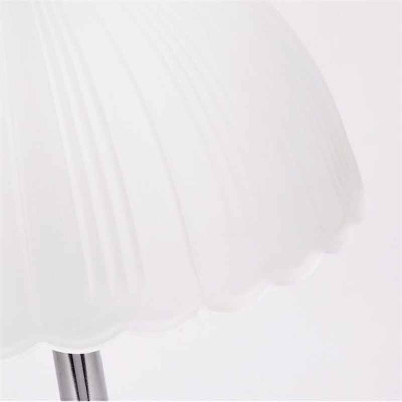 Chất liệu: Chụp đèn được làm từ thủy tinh mờ (frosted glass) chất lượng cao với thiết kế nếp gấp (pleated) độc đáo, mang lại vẻ đẹp cổ điển và mềm mại. Thân và đế đèn làm bằng kim loại mạ crom sáng bóng (polished chrome), tạo cảm giác hiện đại và thanh lịch.