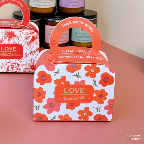 Với họa tiết trang trí nổi bật cùng màu sắc tươi sáng, hộp giấy phù hợp để đựng các món quà nhỏ như nến thơm, bánh kẹo, phụ kiện hoặc đồ handmade. Thiết kế nhỏ gọn giúp món quà trở nên tinh tế và đẹp mắt hơn khi trao tặng.